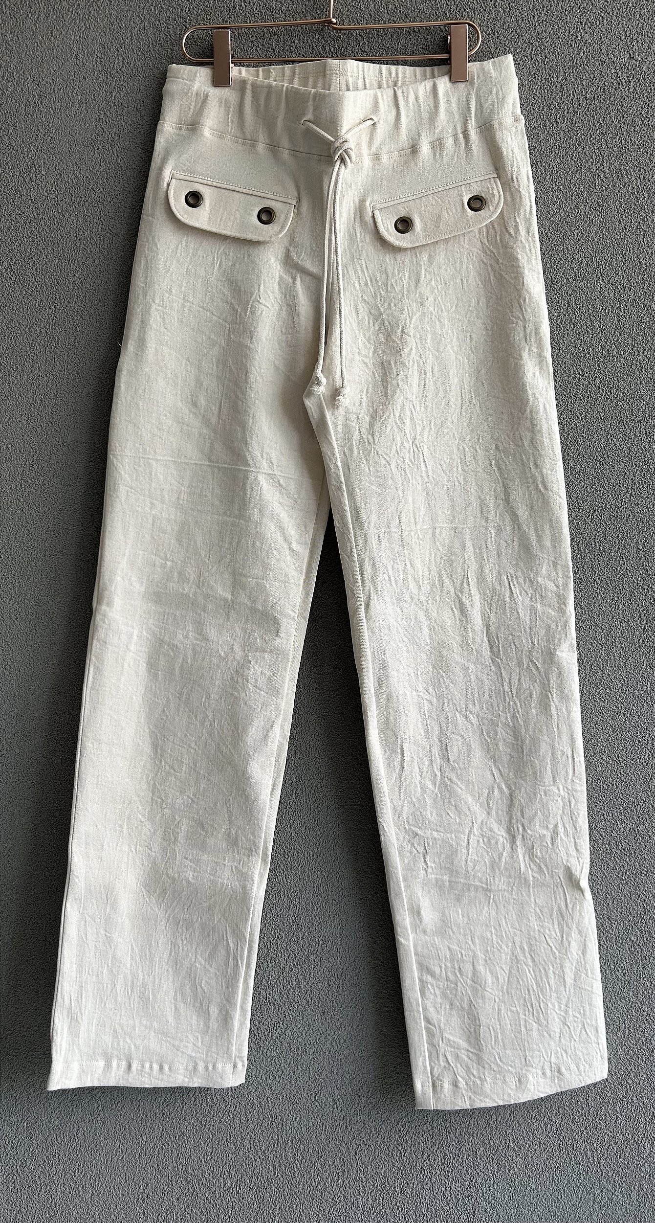 Calça de Sarja, modelo reta com lapela e ilhós.