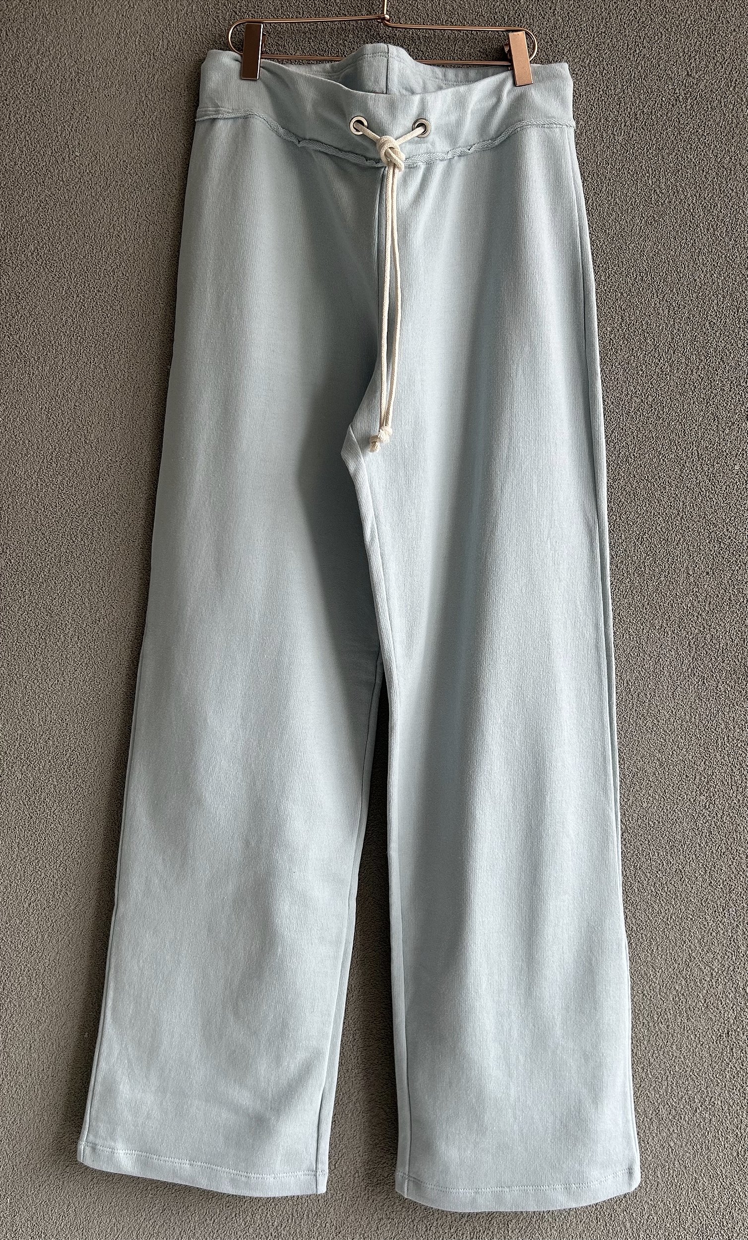 Calça em moletom com cós desfiado, ilhós e cordão, bolso quadrado atrás.