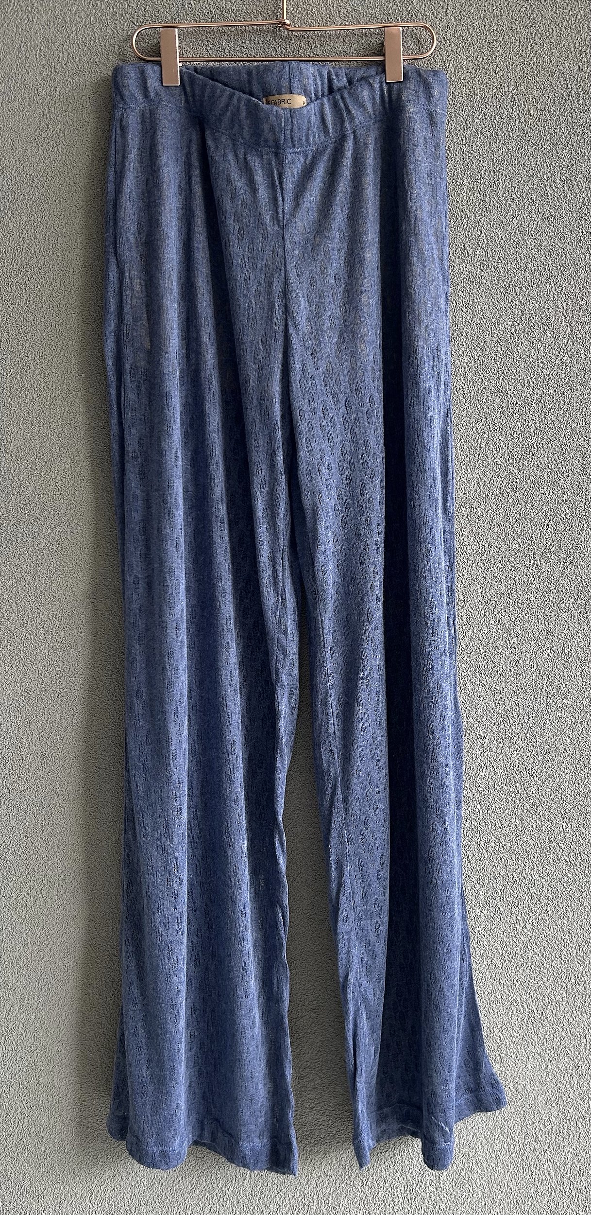 Calça tricot leve azul marinho com estampa levemente transparente, com forro.